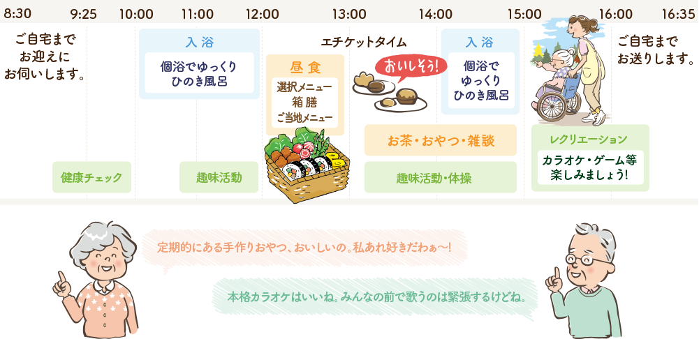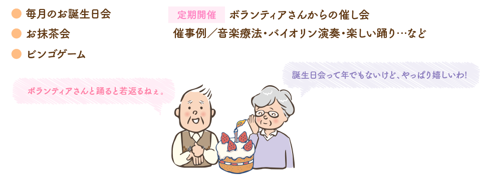楽しい食事と健康的入浴で、笑顔の生活。季節の行事など、楽しい催し物での交流。