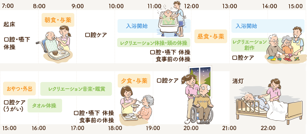 専属のスタッフにより援助させていただきますので、いつご利用していただいても、なじみの顔ぶれで心身ともに安心できる支援環境を準備し、皆様方をお迎えいたします。